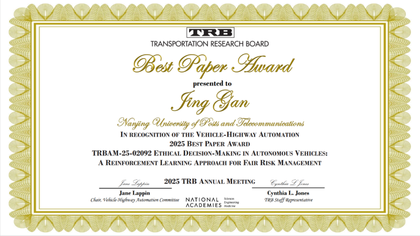 我院教師論文獲交通領域國際頂會TRB ACP30 Committee最佳論文獎